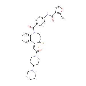 InChI=1S/C35H38F2N4O4/c1-24-28(15-22-45-24)33(43)38-26-11-9-25(10-12-26)34(44)41-21-16-35(36,37)30(29-7-3-4-8-31(29)41)23-32(42)40-19-13-27(14-20-40)39-17-5-2-6-18-39/h3-4,7-12,15,22-23,27H,2,5-6,13-14,16-21H2,1H3,(H,38,43)/b30-23-