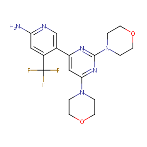 InChI=1S/C18H21F3N6O2/c19-18(20,21)13-9-15(22)23-11-12(13)14-10-16(26-1-5-28-6-2-26)25-17(24-14)27-3-7-29-8-4-27/h9-11H,1-8H2,(H2,22,23)