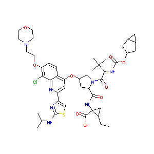 CCC1CC1(C(=O)O)NC(=O)C2CC(CN2C(=O)C(C(C)(C)C)NC(=O)OC3C<br />C4CC4C3)OC5=CC(=NC6=C5C=CC(=C6Cl)OCCN7CCOCC7)C8=CSC(=N8<br />)NC(C)C