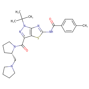 InChI=1S/C26H34N6O2S/c1-17-9-11-18(12-10-17)23(33)28-25-27-22-21(35-25)20(29-32(22)26(2,3)4)24(34)31-15-7-8-19(31)16-30-13-5-6-14-30/h9-12,19H,5-8,13-16H2,1-4H3,(H,27,28,33)/t19-/m0/s1