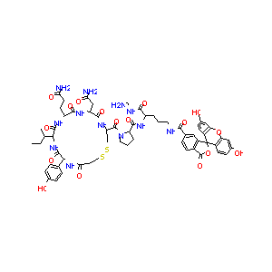 CCC(C)C1C(=O)NC(C(=O)NC(C(=O)NC(CSSCCC(=O)NC(C(=O)N1)C2<br />=CC=C(C=C2)O)C(=O)N3CCCC3C(=O)NC(CCCNC(=O)C4=CC5=C(C=C4<br />)C(=O)OC56C7=C(C=C(C=C7)O)OC8=C6C=CC(=C8)O)C(=O)NCN)CC(<br />=O)N)CCC(=O)N