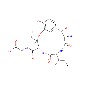 CCC(C)C1C(=O)NC(C(OC2=C(C=CC(=C2)C(C(C(=O)N1)NC)O)O)(C)<br />CC)C(=O)NCC(=O)O