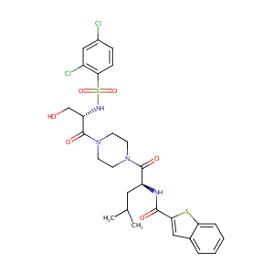 InChI=1S/C28H32Cl2N4O6S2/c1-17(2)13-21(31-26(36)24-14-18-5-3-4-6-23(18)41-24)27(37)33-9-11-34(12-10-33)28(38)22(16-35)32-42(39,40)25-8-7-19(29)15-20(25)30/h3-8,14-15,17,21-22,32,35H,9-13,16H2,1-2H3,(H,31,36)/t21-,22-/m0/s1