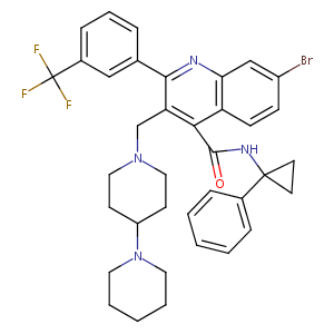 InChI=1S/C37H38BrF3N4O/c38-28-12-13-30-32(23-28)42-34(25-8-7-11-27(22-25)37(39,40)41)31(24-44-20-14-29(15-21-44)45-18-5-2-6-19-45)33(30)35(46)43-36(16-17-36)26-9-3-1-4-10-26/h1,3-4,7-13,22-23,29H,2,5-6,14-21,24H2,(H,43,46)