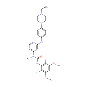 InChI=1S/C26H31Cl2N7O3/c1-5-34-10-12-35(13-11-34)18-8-6-17(7-9-18)31-21-15-22(30-16-29-21)33(2)26(36)32-25-23(27)19(37-3)14-20(38-4)24(25)28/h6-9,14-16H,5,10-13H2,1-4H3,(H,32,36)(H,29,30,31)