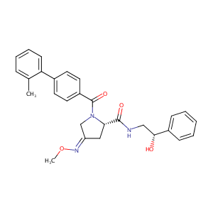 InChI=1S/C28H29N3O4/c1-19-8-6-7-11-24(19)20-12-14-22(15-13-20)28(34)31-18-23(30-35-2)16-25(31)27(33)29-17-26(32)21-9-4-3-5-10-21/h3-15,25-26,32H,16-18H2,1-2H3,(H,29,33)/b30-23-/t25-,26+/m0/s1