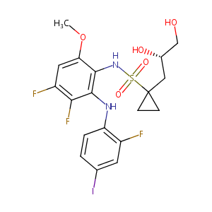 InChI=1S/C19H20F3IN2O5S/c1-30-15-7-13(21)16(22)18(24-14-3-2-10(23)6-12(14)20)17(15)25-31(28,29)19(4-5-19)8-11(27)9-26/h2-3,6-7,11,24-27H,4-5,8-9H2,1H3/t11-/m0/s1