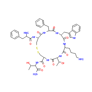 CC(C1C(=O)NC(CSSCC(C(=O)NC(C(=O)NC(C(=O)NC(C(=O)N1)CCCC<br />N)CC2=CNC3=CC=CC=C32)CC4=CC=CC=C4)NC(=O)C(CC5=CC=CC=C5)<br />N)C(=O)NC(C(C)O)C(=O)N)O