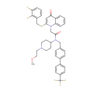InChI=1S/C40H38F5N3O3S/c1-51-22-21-46-19-17-32(18-20-46)47(24-27-9-11-28(12-10-27)29-13-15-31(16-14-29)40(43,44)45)37(50)25-48-35-8-3-2-6-33(35)36(49)23-38(48)52-26-30-5-4-7-34(41)39(30)42/h2-16,23,32H,17-22,24-26H2,1H3