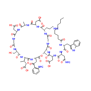 CCCCCCCCCC(=O)NC(CC1=CNC2=CC=CC=C21)C(=O)NC(CC(=O)N)C(=<br />O)NC(CC(=O)O)C(=O)NC3C(OC(=O)C(NC(=O)C(NC(=O)C(NC(=O)CN<br />C(=O)C(NC(=O)C(NC(=O)C(NC(=O)C(NC(=O)CNC3=O)CCCN)CC(=O)<br />O)C)CC(=O)O)CO)C(C)CC(=O)O)CC(=O)C4=CC=CC=C4N)C