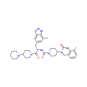 CC1=C2C(=CC(=C1)CC(C(=O)N3CCC(CC3)N4CCCCC4)NC(=O)N5CCC(<br />CC5)N6CC7=C(C(=CC=C7)F)NC6=O)C=NN2