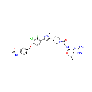 CC(C)CC(C(=O)NCC(=O)N1CCC(CC1)C2=CC(=NN2C)C3=C(C(=C(C=C<br />3)OCC4=CC=C(C=C4)NC(=O)C)Cl)Cl)N=C(N)N