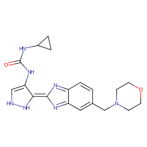 InChI=1S/C19H23N7O2/c27-19(21-13-2-3-13)24-16-10-20-25-17(16)18-22-14-4-1-12(9-15(14)23-18)11-26-5-7-28-8-6-26/h1,4,9-10,13,20,25H,2-3,5-8,11H2,(H2,21,24,27)/b18-17-