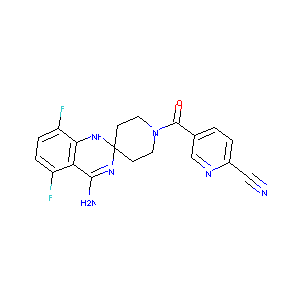 C1CN(CCC12NC3=C(C=CC(=C3C(=N2)N)F)F)C(=O)C4=CN=C(C=C4)C<br />#N