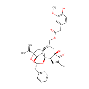 InChI=1S/C37H40O9/c1-21(2)35-17-23(4)37-27(33(35)44-36(45-35,46-37)19-24-9-7-6-8-10-24)14-26(18-34(41)30(37)13-22(3)32(34)40)20-43-31(39)16-25-11-12-28(38)29(15-25)42-5/h6-15,23,27,30,33,38,41H,1,16-20H2,2-5H3/t23-,27+,30-,33-,34-,35-,36-,37-/m1/s1