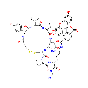 CCC(C)C1C(=O)NC(C(=O)NC(C(=O)NC(CSSCCC(=O)NC(C(=O)N1)C2<br />=CC=C(C=C2)O)C(=O)N3CCCC3C(=O)NC(CCCCNC(=O)C4=CC5=C(C=C<br />4)C(=O)OC56C7=C(C=C(C=C7)O)OC8=C6C=CC(=C8)O)C(=O)NCN)CC<br />(=O)N)C(C)O