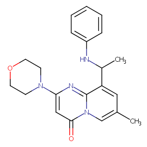 InChI=1S/C21H24N4O2/c1-15-12-18(16(2)22-17-6-4-3-5-7-17)21-23-19(13-20(26)25(21)14-15)24-8-10-27-11-9-24/h3-7,12-14,16,22H,8-11H2,1-2H3
