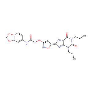 InChI=1S/C23H24N6O7/c1-3-7-28-21-19(22(31)29(8-4-2)23(28)32)25-20(26-21)16-10-18(27-36-16)33-11-17(30)24-13-5-6-14-15(9-13)35-12-34-14/h5-6,9-10,27H,3-4,7-8,11-12H2,1-2H3,(H,24,30)/b20-16-