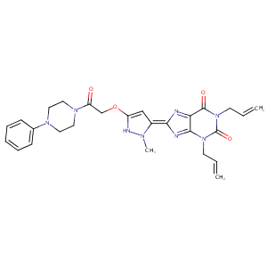 InChI=1S/C27H30N8O4/c1-4-11-34-25-23(26(37)35(12-5-2)27(34)38)28-24(29-25)20-17-21(30-31(20)3)39-18-22(36)33-15-13-32(14-16-33)19-9-7-6-8-10-19/h4-10,17,30H,1-2,11-16,18H2,3H3/b24-20-