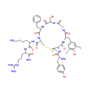 1S/C52H72I2N14O12S2/c1-52(2)42(68-44(74)33(56)21-28-13-15-30(70)16-14-28)50(80)66-36(23-29-19-31(53)41(72)32(54)20-29)45(75)61-24-40(71)62-38(25-69)48(78)65-37(22-27-9-4-3-5-10-27)47(77)67-39(26-81-82-52)49(79)64-35(11-6-7-17-55)46(76)63-34(43(57)73)12-8-18-60-51(58)59/h3-5,9-10,13-16,19-20,33-39,42,69-70,72H,6-8,11-12,17-18,21-26,55-56H2,1-2H3,(H2,57,73)(H,61,75)(H,62,71)(H,63,76)(H,64,79)(H,65,78)(H,66,80)(H,67,77)(H,68,74)(H4,58,59,60)/t33-,34-,35-,36-,37+,38-,39+,42-/m0/s1