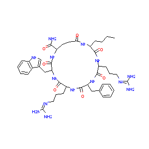 CCCCC1C(=O)NC(C(=O)NC(C(=O)NC(C(=O)NC(C(=O)NC(CCC(=O)N1<br />)C(=O)N)CC2=CNC3=CC=CC=C32)CCCN=C(N)N)CC4=CC=CC=C4)CCCN<br />=C(N)N