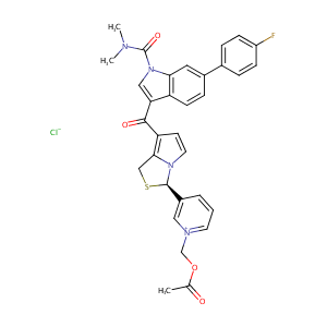 InChI=1S/C32H28FN4O4S.ClH/c1-20(38)41-19-35-13-4-5-23(16-35)31-36-14-12-26(29(36)18-42-31)30(39)27-17-37(32(40)34(2)3)28-15-22(8-11-25(27)28)21-6-9-24(33)10-7-21;/h4-17,31H,18-19H2,1-3H3;1H/q+1;/p-1/t31-;/m1./s1