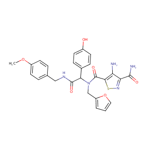 InChI=1S/C26H25N5O6S/c1-36-18-10-4-15(5-11-18)13-29-25(34)22(16-6-8-17(32)9-7-16)31(14-19-3-2-12-37-19)26(35)23-20(27)21(24(28)33)30-38-23/h2-12,22,32H,13-14,27H2,1H3,(H2,28,33)(H,29,34)