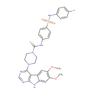 O=S(=O)(c1ccc(NC(=S)N2CCN(c3ncnc4c3c3c(cc(c(c3)OC)OC)[n<br />H]4)CC2)cc1)Nc1ccc(cc1)F