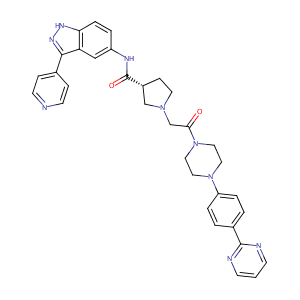 InChI=1S/C33H33N9O2/c43-30(42-18-16-41(17-19-42)27-5-2-24(3-6-27)32-35-11-1-12-36-32)22-40-15-10-25(21-40)33(44)37-26-4-7-29-28(20-26)31(39-38-29)23-8-13-34-14-9-23/h1-9,11-14,20,25H,10,15-19,21-22H2,(H,37,44)(H,38,39)/t25-/m1/s1