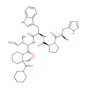 InChI=1S/C40H53N9O6/c1-3-26(2)34(38(54)49-19-10-7-15-40(49,24-50)39(55)47-16-8-4-9-17-47)46-35(51)32(20-27-22-43-31-13-6-5-12-29(27)31)45-36(52)33-14-11-18-48(33)37(53)30(41)21-28-23-42-25-44-28/h3,5-6,12-13,22-26,30,32-34,43H,1,4,7-11,14-21,41H2,2H3,(H,42,44)(H,45,52)(H,46,51)/t26-,30+,32+,33-,34-,40-/m0/s1