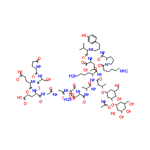 CC(C)CC(C(=O)O)NC(=O)C(C(C)C)NCC(CC1=CC=C(C=C1)O)NC(=O)<br />C2CCCN2C(=O)C(CCCCN)NC(=O)C(CCCCN)NC(=O)C(C(C)OC3CC(C(C<br />(C3NC(=O)C)OC4CC(C(C(C4O)O)O)CO)O)CO)NC(=O)C(C)NC(=O)C(<br />CC(=O)N)NC(=O)C(CO)NC(=O)CNC(=O)CNC(=O)C(CCC(=O)O)NC(=O<br />)C(CCC(=O)O)NC(=O)C(CO)NC(=O)C5CCC(=O)N5