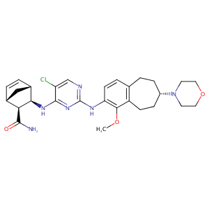 InChI=1S/C28H35ClN6O3/c1-37-25-20-8-7-19(35-10-12-38-13-11-35)6-4-16(20)5-9-22(25)32-28-31-15-21(29)27(34-28)33-24-18-3-2-17(14-18)23(24)26(30)36/h2-3,5,9,15,17-19,23-24H,4,6-8,10-14H2,1H3,(H2,30,36)(H2,31,32,33,34)/t17-,18+,19+,23+,24-/m1/s1