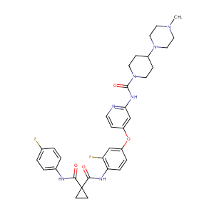 InChI=1S/C33H37F2N7O4/c1-40-16-18-41(19-17-40)24-9-14-42(15-10-24)32(45)39-29-21-26(8-13-36-29)46-25-6-7-28(27(35)20-25)38-31(44)33(11-12-33)30(43)37-23-4-2-22(34)3-5-23/h2-8,13,20-21,24H,9-12,14-19H2,1H3,(H,37,43)(H,38,44)(H,36,39,45)