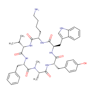 InChI=1S/C44H56N8O7/c1-26(2)38-43(58)50-37(23-28-12-6-5-7-13-28)44(59)52(4)27(3)39(54)48-35(22-29-17-19-31(53)20-18-29)41(56)49-36(24-30-25-46-33-15-9-8-14-32(30)33)42(57)47-34(40(55)51-38)16-10-11-21-45/h5-9,12-15,17-20,25-27,34-38,46,53H,10-11,16,21-24,45H2,1-4H3,(H,47,57)(H,48,54)(H,49,56)(H,50,58)(H,51,55)/t27-,34-,35-,36+,37-,38-/m0/s1