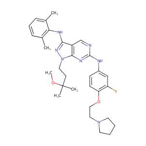 C1CCCN1CCOc1c(cc(cc1)Nc1ncc2c(n1)n(nc2Nc1c(cccc1C)C)CCC<br />(C)(C)OC)F