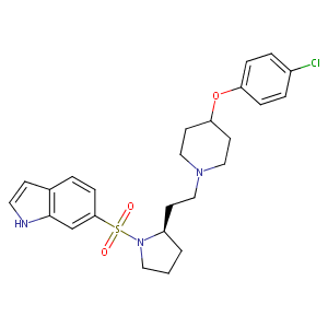 InChI=1S/C25H30ClN3O3S/c26-20-4-6-22(7-5-20)32-23-11-16-28(17-12-23)15-10-21-2-1-14-29(21)33(30,31)24-8-3-19-9-13-27-25(19)18-24/h3-9,13,18,21,23,27H,1-2,10-12,14-17H2/t21-/m1/s1