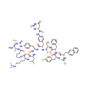 Ref 528235J Med Chem. 2006 Jun 15;49(12):3536-43.Novel analogues of degarelix incorporating hydroxy-, methoxy-, and pegylated-urea moieties at positions 3, 5, 6 and the N-terminus. Part III.