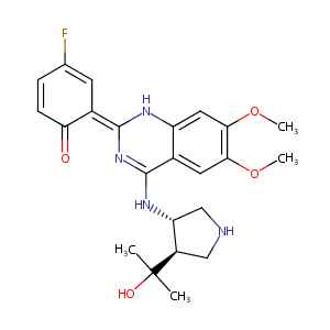 InChI=1S/C23H27FN4O4/c1-23(2,30)15-10-25-11-17(15)27-21-13-8-19(31-3)20(32-4)9-16(13)26-22(28-21)14-7-12(24)5-6-18(14)29/h5-9,15,17,25-26,30H,10-11H2,1-4H3,(H,27,28)/b22-14-/t15-,17-/m1/s1
