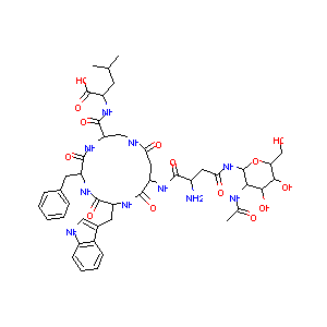 CC(C)CC(C(=O)O)NC(=O)C1CNC(=O)CC(C(=O)NC(C(=O)NC(C(=O)N<br />1)CC2=CC=CC=C2)CC3=CNC4=CC=CC=C43)NC(=O)C(CC(=O)NC5C(C(<br />C(C(O5)CO)O)O)NC(=O)C)N