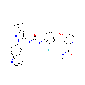 CC(C)(C)C1=NN(C(=C1)NC(=O)NC2=C(C=C(C=C2)OC3=CC(=NC=C3)<br />C(=O)NC)F)C4=CC5=C(C=C4)N=CC=C5