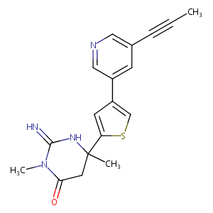 N1C(CC(=O)N(C1=N)C)(c1scc(c1)c1cc(cnc1)C#CC)C
