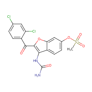 CS(=O)(=O)Oc1ccc2c(NC(=O)N)c(oc2c1)C(=O)c3ccc(Cl)cc3Cl