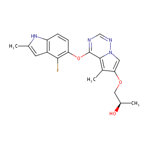 InChI=1S/C19H19FN4O3/c1-10-6-13-14(23-10)4-5-15(17(13)20)27-19-18-12(3)16(26-8-11(2)25)7-24(18)22-9-21-19/h4-7,9,11,23,25H,8H2,1-3H3/t11-/m1/s1