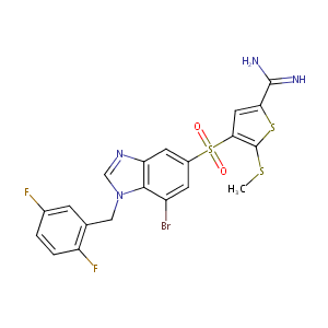 InChI=1S/C20H15BrF2N4O2S3/c1-30-20-17(7-16(31-20)19(24)25)32(28,29)12-5-13(21)18-15(6-12)26-9-27(18)8-10-4-11(22)2-3-14(10)23/h2-7,9H,8H2,1H3,(H3,24,25)