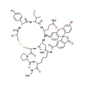 CCC(C)C1C(=O)NC(C(=O)NC(C(=O)NC(CSSCC(C(=O)NC(C(=O)N1)C<br />2=CC=C(C=C2)O)O)C(=O)N3CCCC3C(=O)NC(CCCCNC(=O)C4=CC5=C(<br />C=C4)C(=O)OC56C7=C(C=C(C=C7)O)OC8=C6C=CC(=C8)O)C(=O)NCN<br />)CC(=O)N)CCC(=O)N