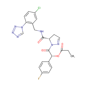InChI=1S/C23H21ClFN7O4/c1-2-20(33)36-21(14-3-6-17(25)7-4-14)23(35)32-19(9-10-28-32)22(34)26-12-15-11-16(24)5-8-18(15)31-13-27-29-30-31/h3-8,10-11,13,19,21H,2,9,12H2,1H3,(H,26,34)/t19-,21+/m0/s1