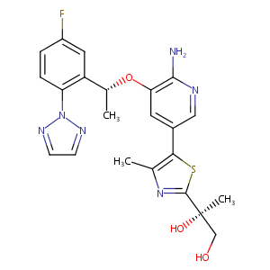 InChI=1S/C22H23FN6O3S/c1-12-19(33-21(28-12)22(3,31)11-30)14-8-18(20(24)25-10-14)32-13(2)16-9-15(23)4-5-17(16)29-26-6-7-27-29/h4-10,13,30-31H,11H2,1-3H3,(H2,24,25)/t13-,22-/m1/s1