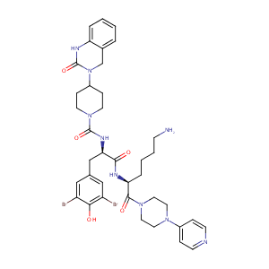 InChI=1S/C38H47Br2N9O5/c39-29-21-25(22-30(40)34(29)50)23-33(45-37(53)48-15-10-28(11-16-48)49-24-26-5-1-2-6-31(26)44-38(49)54)35(51)43-32(7-3-4-12-41)36(52)47-19-17-46(18-20-47)27-8-13-42-14-9-27/h1-2,5-6,8-9,13-14,21-22,28,32-33,50H,3-4,7,10-12,15-20,23-24,41H2,(H,43,51)(H,44,54)(H,45,53)/t32-,33+/m0/s1