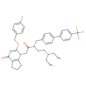 InChI=1S/C36H38F4N4O2S/c1-3-42(4-2)20-21-43(22-25-8-12-27(13-9-25)28-14-16-29(17-15-28)36(38,39)40)33(45)23-44-32-7-5-6-31(32)34(46)41-35(44)47-24-26-10-18-30(37)19-11-26/h8-19H,3-7,20-24H2,1-2H3