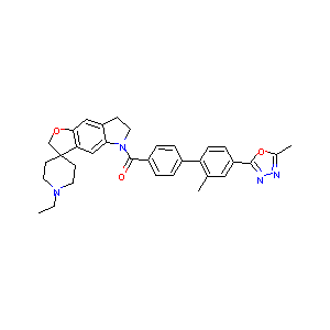 CCN1CCC2(CC1)COC3=CC4=C(C=C23)N(CC4)C(=O)C5=CC=C(C=C5)C<br />6=C(C=C(C=C6)C7=NN=C(O7)C)C